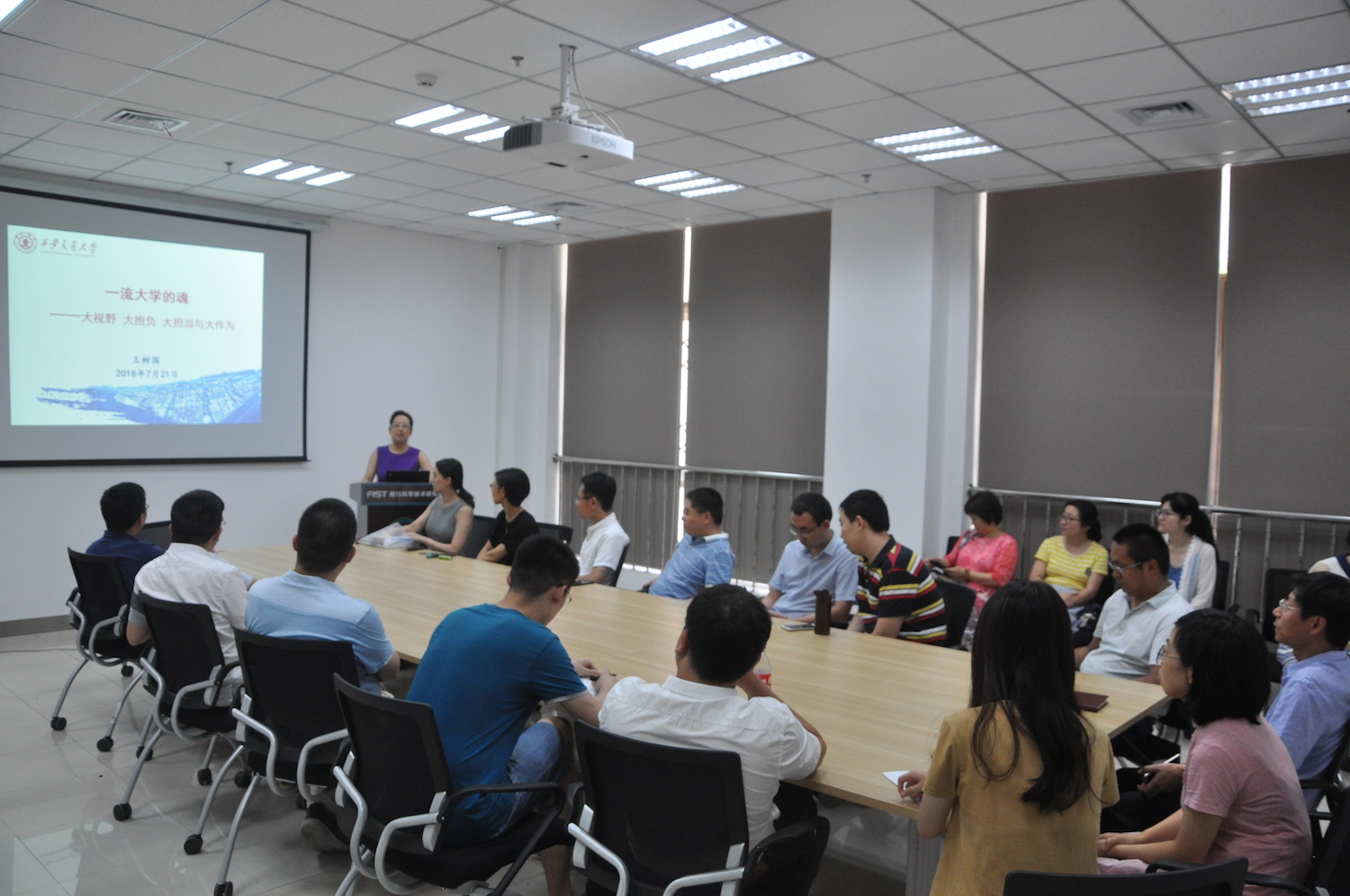 孟祥丽副院长首先向与会人员介绍了学校暑期工作会议的情况,传达了王树国校长在学校暑期会议上的讲话精神。王校长的讲话主要围绕“一流大学的魂——大视野 大抱负 大担当与大作为”的主题展开,就当前的国际国内形势下,围绕“双一流建设”对学校的机遇与挑战进行了剖析,提出学校当前应有的大视野、大抱负、大担当、大作为,把自身融入社会发展之中,创造无愧于时代的历史业绩,成为西迁精神新传人。同时,对2018年上半年的工作做了总结,介绍了学校2018年上半年在人才培养、科学研究、创新港建设进展等各个方面取得了很多可喜的成绩。
