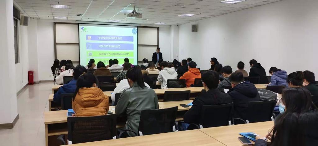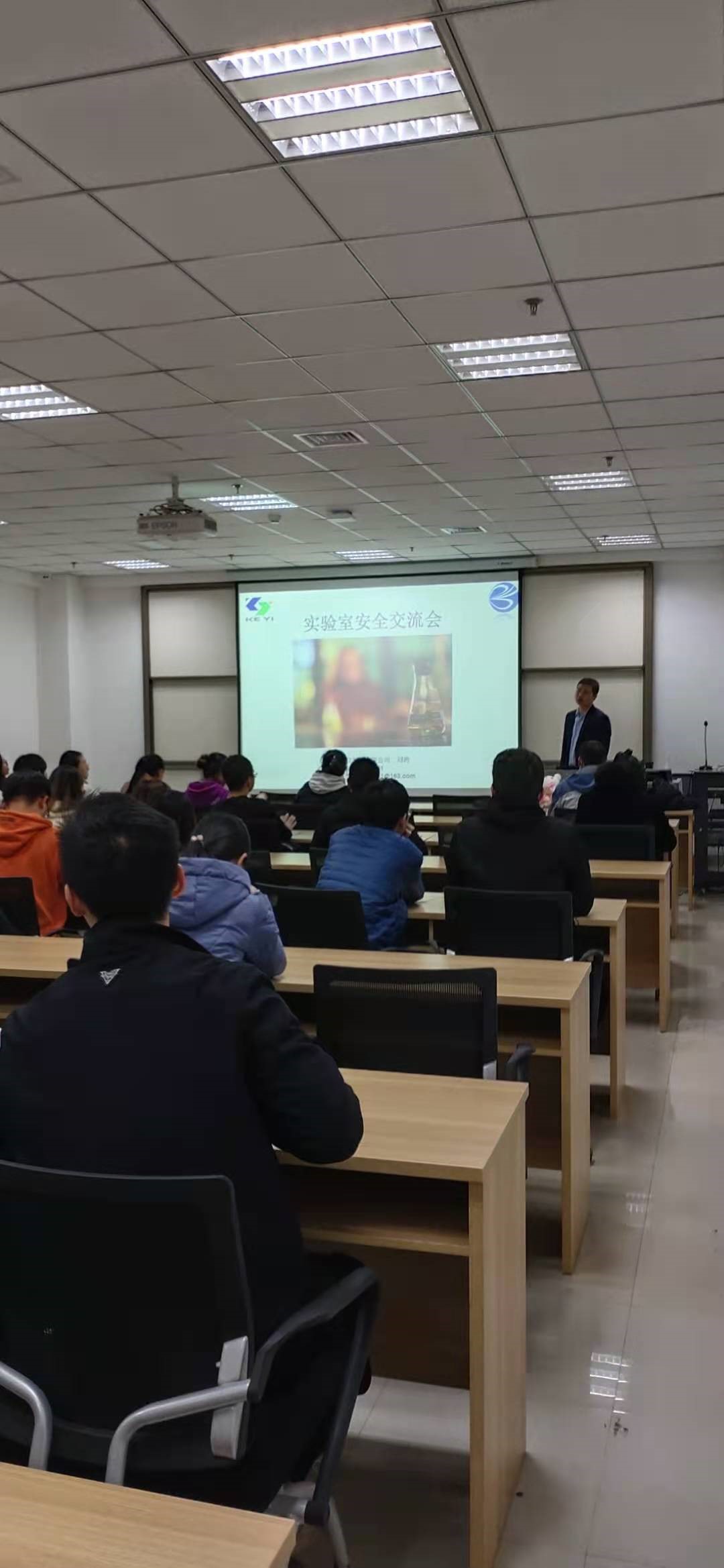 接着,他分析了实验室面临的危害,详细给同学们阐述了化学危险品、易燃易爆和易制毒的管理和存放,压力容器的管理,个人防护措施的重要性、用水用电安全,消防安全等相关安全知识。在制度建设方面,给同学们讲述了安全相关法律法规以及安全准入制度、风险评价制度等相关制度建设的方法和重要性。