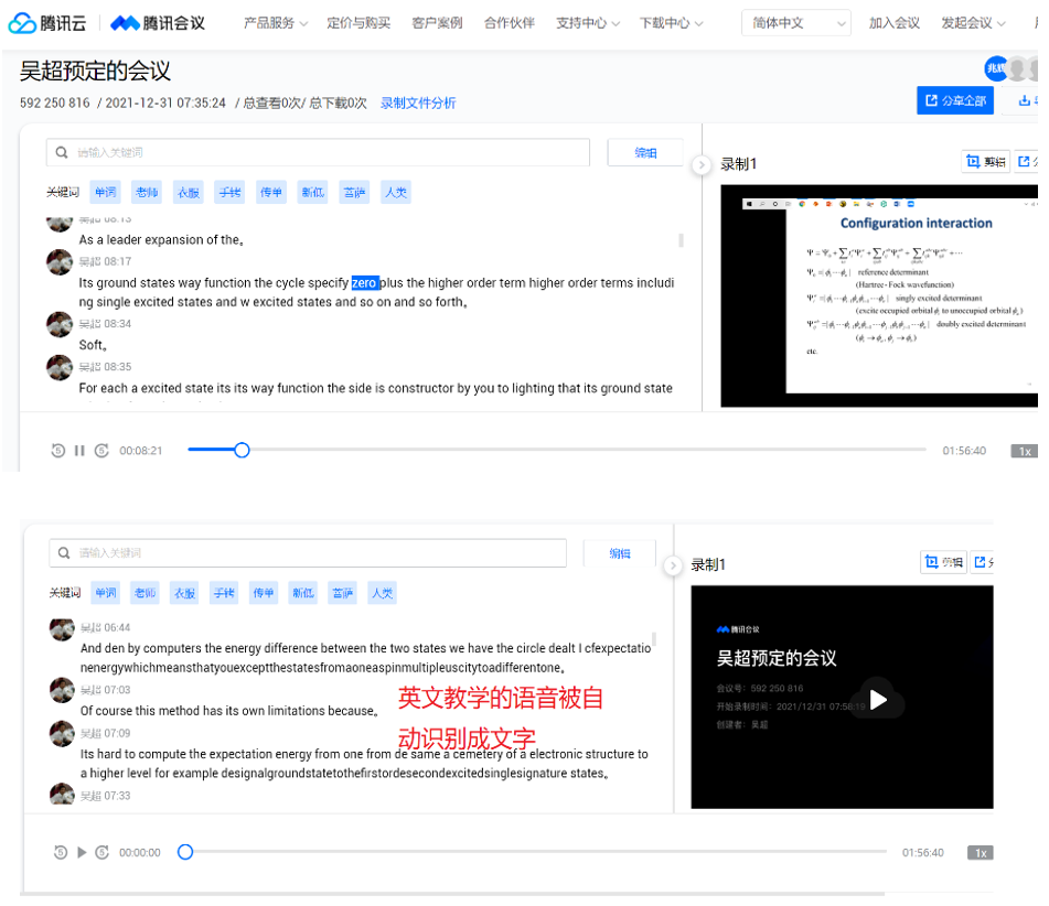 吴超是全英文课程Electronic Structure of Molecules的授课教师,线上授课期间,吴超利用腾讯会议将每节课进行录屏,便于学生回放学习,并将腾讯会议的语音对话转化为文字(包括英文),形成课程脚本,增加教学灵活性。