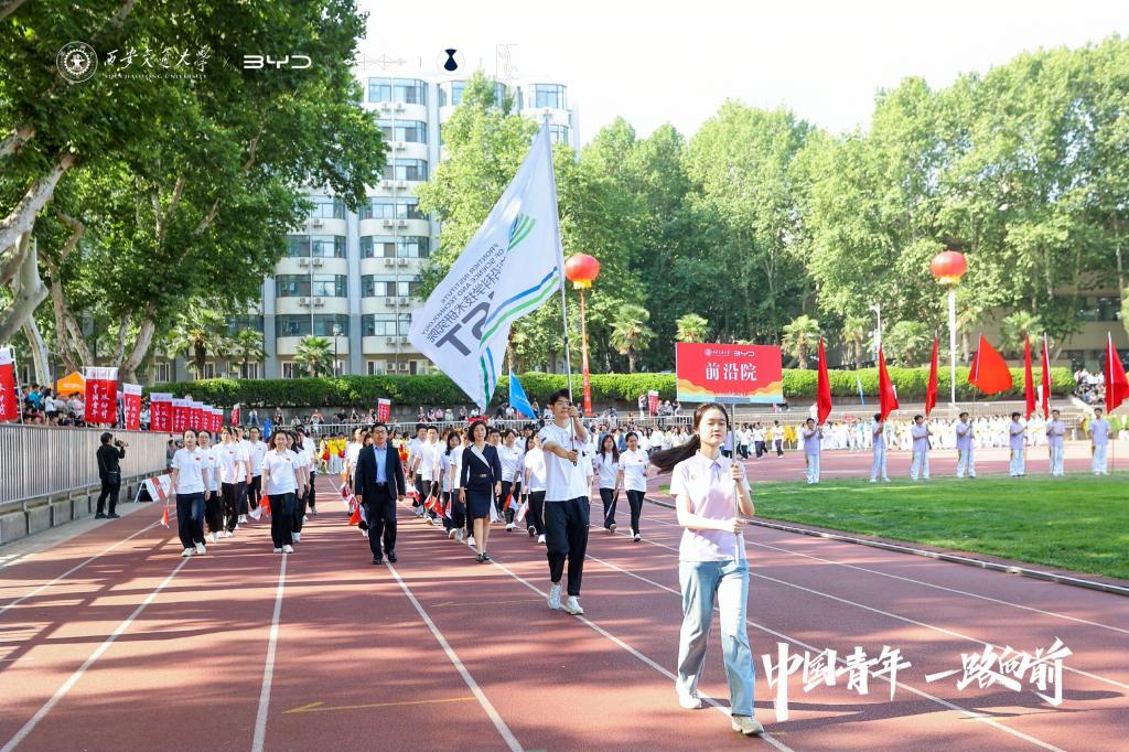 伴随着激昂旋律,bwin方阵昂首踏入会场,前沿师生挥舞着鲜红国旗与蓝白色院旗,方阵行至主席台前,队伍高喊口号,彰显着学科交叉的无限可能。