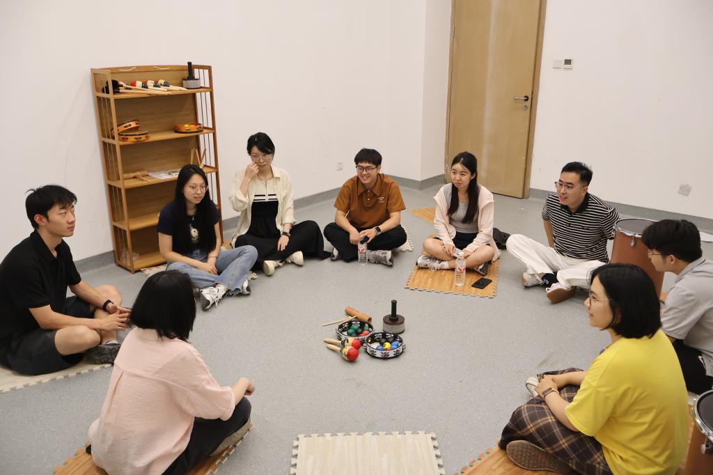 随后,欧欢老师与参与活动的学生共同开展了首场音乐治疗体验课程。通过沉浸式互动,参与者亲身感受音乐在情感联结与压力释放中的独特力量,为“泓润音乐治疗室”的服务实践拉开序幕。