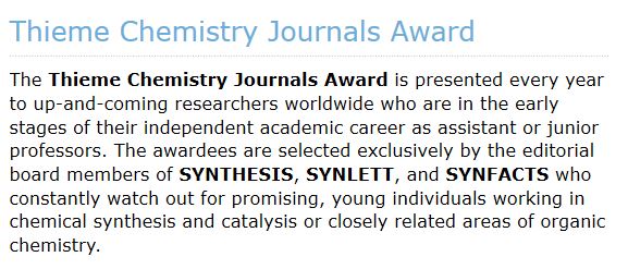 该奖项设立于1999年,由德国Thieme数据库三大化学期刊Synthesis、Synlett和Synfacts的学术编委会在全球范围内遴选,授予在化学合成、催化及有机化学其他相关领域取得出色成果并具有很大发展潜力的青年学者,旨在认可和鼓励年轻一代有机化学家。2020年全球范围内有112人获此殊荣。