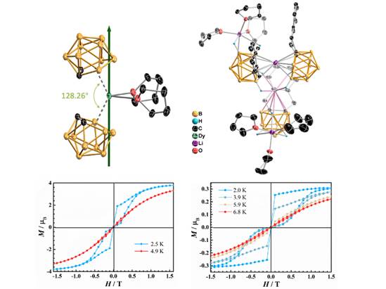在郑彦臻教授指导下,西安交通大学bwin直博生金鹏博经过两年的探索,合成出了一系列夹心和半夹心状镝基碳硼烷配合物。磁性研究发现这两类配合物都如预期般表现出明显的单分子磁体行为。尤其半夹心结构的例子中,镝离子位于碳硼烷五元环中心的正上方,且两者之间距离非常短,明显具有有很强的相互作用力。这使得镝离子产生很强的磁各向异性,有效磁反转能垒达到了804 K。从而,该工作首次预测并实现了基于碳硼烷的镝单分子磁体。值得一提的是,相比环戊二烯而言,碳硼烷稀土化学在分子磁性方面的研究才刚刚起步,仍具有很大的挖掘空间。