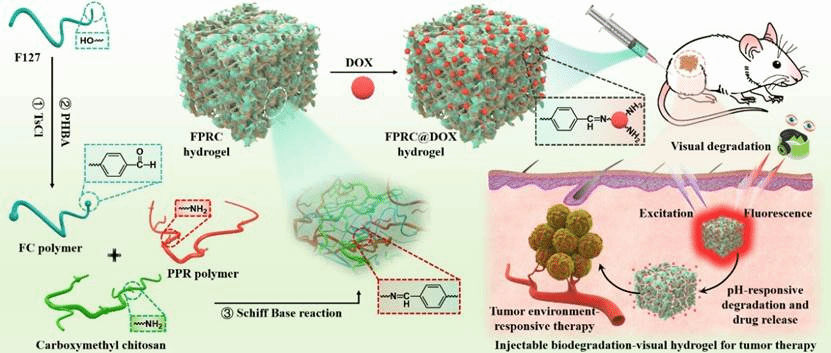 图1.FPRC多功能柠檬酸水凝胶材料设计与肿瘤治疗-材料示踪应用示意图。