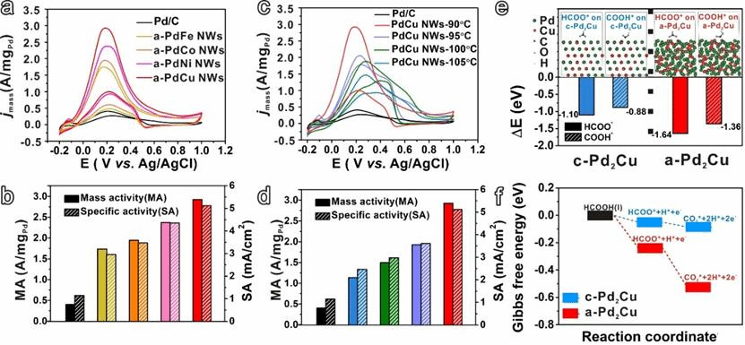 针对上述问题,西安交通大学金明尚教授课题组通过一种通用的电偶置换辅助策略,在低温下成功制备出非晶态PdM合金纳米线(a-PdM NWs, M = Fe, Co, Ni, Cu)。在该研究中,利用配体吸附产生非贵金属材料的非晶核,在低温环境下通过置换反应引入钯原子,从而实现PdM(M = Cu, Fe, Co, Ni)非晶态合金纳米线的制备。非晶纳米线在电催化氧化甲酸反应中表现出极其最优的催化性能。以钯铜非晶合金纳米线为例,其电催化甲酸氧化反应的质量活性和面积活性分别达到2.93 A/mgPd和5.33 mA/cm2,这是迄今为止所报道的钯铜基催化剂中的最高值。该研究表明了非晶态合金催化剂相比晶态材料在催化领域中的巨大优势。进一步的理论计算表明非晶结构可以有效活化稳定的C-H键,从而显著促进甲酸的解离。