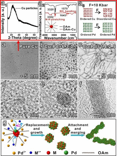 图2. 利用非晶态非贵金属纳米核诱导产生非晶态钯基纳米线。