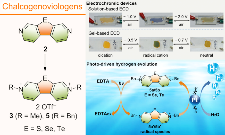 针对上述问题,西安交通大学bwin何刚教授课题组将硫族元素(S, Se, Te)引入紫罗精骨架中,成功制备了含硫族元素紫罗精小分子衍生物,并将其命名为“Chalcogenoviologens”。研究发现,含硫族元素紫罗精具有以下特性:(1)具有更刚性的骨架;(2)具有多个氧化还原中心,表现出非常丰富的电化学行为;(3)在保持很低LUMO能级的同时,极大地降低了体系的能隙(能隙降低至2.33 eV),其光学吸收红移至可见光区。含硫族元素紫罗精不仅成功应用于电致变色器件,而且在可见光催化析氢反应中也表现出了优异的性能。含硫族元素紫罗精可同时作为光敏剂和电子转移剂,这不仅大大简化了可见光催化析氢反应,而且还大幅提高了可见光催化的效率。以上研究结果以论文形式于发表在国际化学领域权威期刊Angewandte Chemie International Edition (影响因子11.994)上,论文题目为“Narrow Band Gap Chalcogenoviologens for Electrochromism and Visible-Light-Driven Hydrogen Evolution”。bwin博士生李国平为本论文第一作者,西安交通大学bwin为本文唯一通讯作者单位。这也是何刚教授课题组在含硫族元素杂环芳烃领域继2017年(Angew. Chem. Int. Ed. 2017, 56, 15334-15338)之后的又一重要突破。
