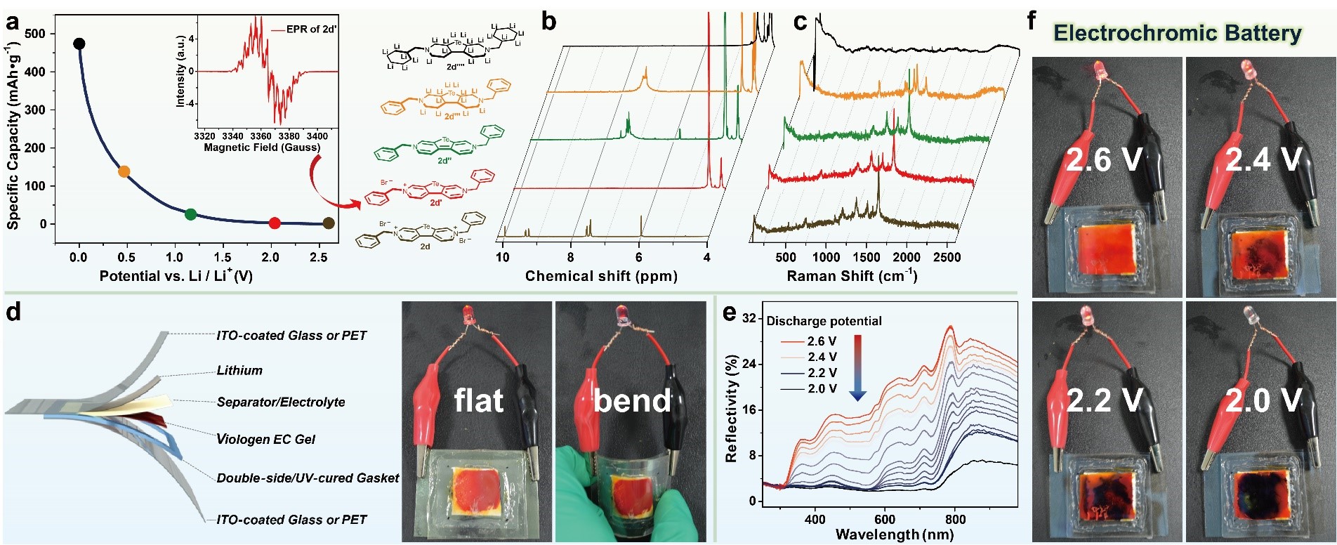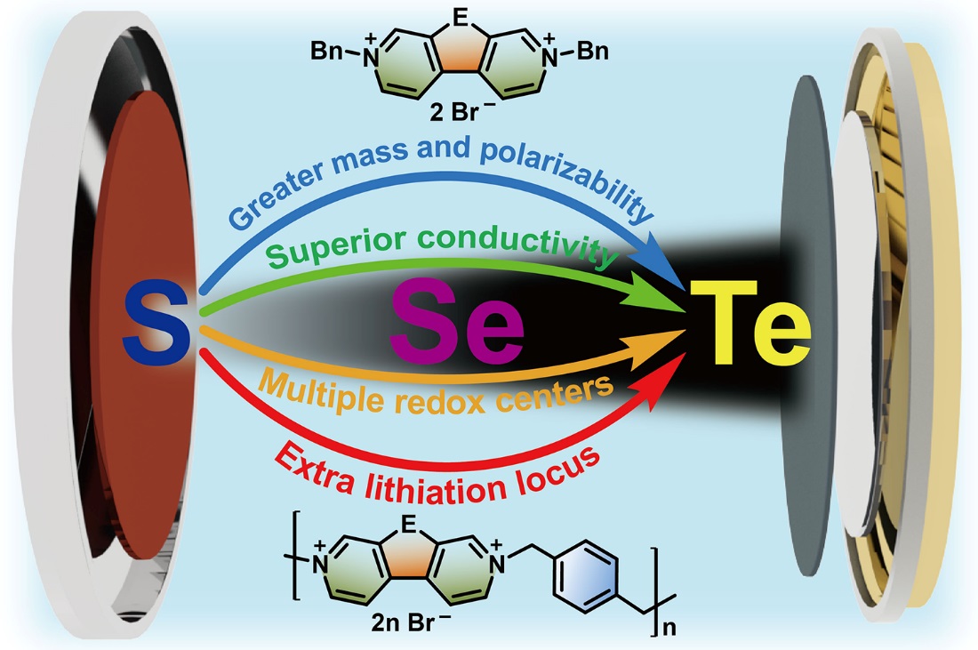 基于上述考虑,西安交通大学的何刚教授在前期含硫族元素紫罗精的研究基础上,成功制备了含硫族元素紫罗精聚合物,并将其作为电极材料应用到有机自由基锂离子电池中。研究发现,随着硫//碲的引入,电池容量及循环稳定性都有大幅提升。其中含碲紫罗精聚合物表现出了最优的性能,当库伦效率达到100%时容量达到了502 mAh g-1。相关机理研究表明随着碲原子的引入极大提高了电极材料的电导率以及增加了锂化位点。在此基础之上,将含碲元素紫罗精聚合物的电致变色性质与电池应用相结合,制备了一种新型的柔性变色电池,在电池的充放电过程中,伴随着明显的颜色变化。这一研究工作不仅发展了一类新型的有机自由基电池,还为变色电池领域的研究提供了新的思路。