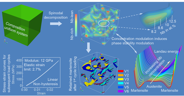 近日,西安交大bwin微观组织科学中心的博士生朱家明与他的合作者提出了一种全新的材料设计概念:综合利用成分波动调控效应和预加载荷效应来对形状记忆合金中的马氏体相变进行改性,进而优化其力学性能。。通过相场模拟该课题组证明:(1)在形状记忆合金中引入成分波动可以有效的调控马氏体相变的动力学过程,将其从强一级相变转变为宏观连续相变;(2)通过预加载荷引入的马氏体核胚避免了马氏体相变过程中的重复形核,使得马氏体相变直接进入长大阶段。利用这一概念,该课题组设计出了一种全新的形状记忆合金,这种合金同时具备超低模量(12 GPa)、零滞后和线性超弹性(2.7%),能够有效的解决应力屏蔽效应,同时为开发高效率高精度驱动器提供了条件。