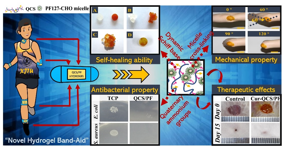 近日,西安交通大学bwin郭保林课题组合成的季胺化壳聚糖(QCS)与芳香醛基功能化的Pluronic® F127三嵌段共聚物(PF127-CHO)进行动态化学键交联,报道了同时具有快速自愈合、良好机械性能、高粘合力、抗菌性能的可注射水凝胶敷料。该水凝胶的原位成胶和组织粘合性能可以快速的封闭任意形状的伤口、并与伤口轮廓粘合为其提供物理屏障并模拟皮肤的湿润环境,同时凝胶的止血性能和抗菌性能可以让伤口快速止血并防止伤口感染。同时,基于动态席夫碱键和共聚物的胶术交联两种作用,水凝胶敷料被赋予与人体皮肤相似的模量,展示出易延展,易压缩的机械性能,极大降低传统敷料捆绑伤口而带来的不适感。最后,负载活性药物姜黄素后的凝胶表现出抗氧化性与凝胶本身多种性能结合从而促进全皮层缺损伤口快速愈合。因此,该水凝胶作为生物活性敷料在伤口愈合应用中具有巨大潜力。