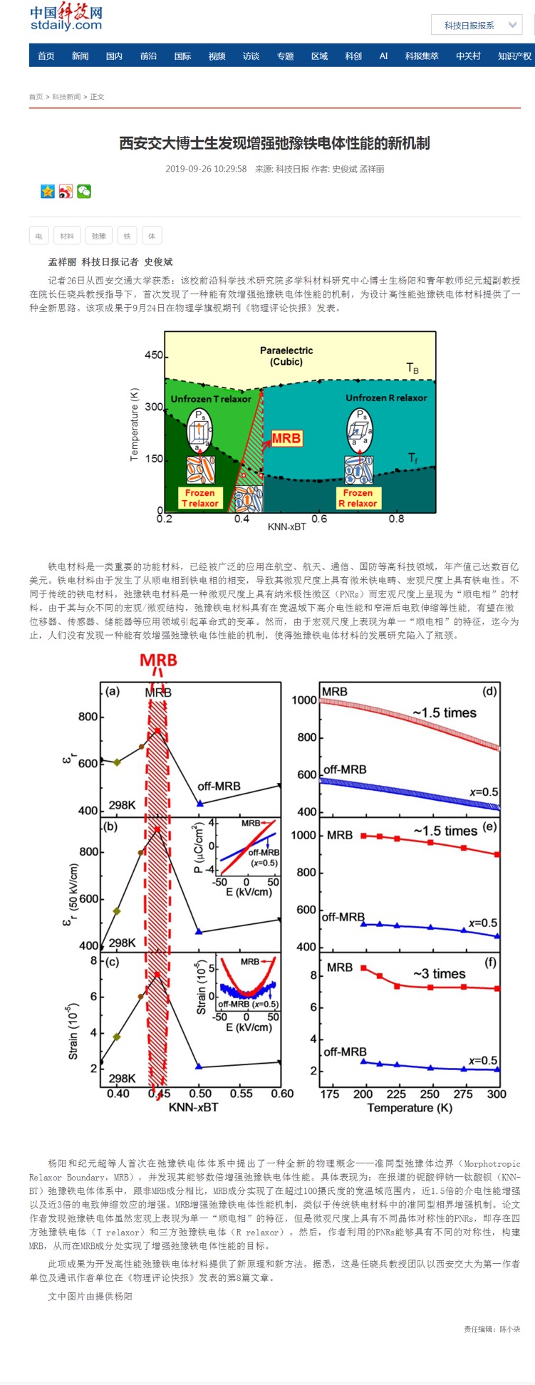杨阳和纪元超等人首次在弛豫铁电体体系中提出了一种全新的物理概念——准同型弛豫体边界(Morphotropic Relaxor Boundary,MRB),并发现其能够数倍增强弛豫铁电体性能。具体表现为:在报道的铌酸钾钠—钛酸钡(KNN-BT)弛豫铁电体体系中,跟非MRB成分相比,MRB成分实现了在超过100摄氏度的宽温域范围内,近1.5倍的介电性能增强以及近3倍的电致伸缩效应的增强。MRB增强弛豫铁电体性能机制,类似于传统铁电材料中的准同型相界增强机制。论文作者发现弛豫铁电体虽然宏观上表现为单一“顺电相”的特征,但是微观尺度上具有不同晶体对称性的PNRs,即存在四方弛豫铁电体(T relaxor)和三方弛豫铁电体(R relaxor)。然后,作者利用的PNRs能够具有不同的对称性,构建MRB,从而在MRB成分处实现了增强弛豫铁电体性能的目标。