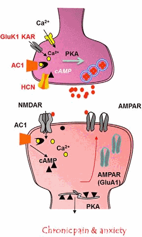 在ACC(anterior cingulate cortex)的兴奋传递中,神经损伤和相关的焦虑会同时激活突触前LTP(long-term potentiation)和突触后的LTP。突触前LTP和突触后LTP之间的协同作用增强了行为反应表现。