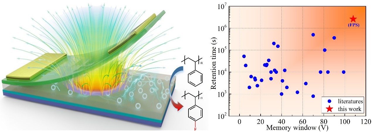 近日,bwin鲁广昊教授课题组与电气学院李盛涛教授课题组、理学院张志成教授课题组、中科院长春应用化学研究所崔冬梅研究员课题组开展合作,通过自由基聚合合成了一种新型绝缘聚合物分子:无规4-氟代聚苯乙烯(Poly(4-fluorostyrene)FPS。该聚合物具有较高的深电荷陷阱密度、高击穿场强、高热稳定性和疏水性,可实现高度稳定的驻极体。以FPS薄膜作为栅极介电层,并以C12-BTBT作为半导体层制备的有机场效应晶体管具有高达11.2 cm2·V-1·s-1的场效应迁移率,高达107的开/关比和较小的阈值电压。与广泛使用的聚苯乙烯相比,FPS的电子和空穴陷阱密度及陷阱能级均有所上升,带来6.8×1012 cm-2的高带电量。利用FPS制备的OFET存储器件可在大于100 V的宽存储窗口下工作,并具有在空气环境中大于一个月的存储稳定性。