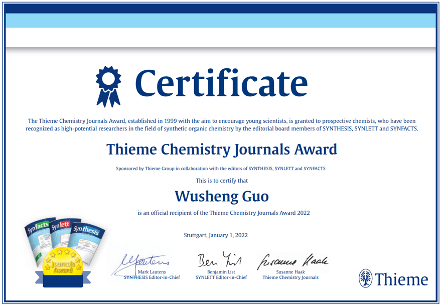 该奖项设立于1999年,由德国Thieme数据库三大化学期刊Synthesis、Synlett和Synfacts的学术编委会在全球范围内遴选,授予在化学合成、催化及有机化学相关领域取得出色成果并具有突出发展潜力的青年学者,旨在认可和鼓励年轻一代有机化学家。2022年全球范围内有79人获此殊荣。