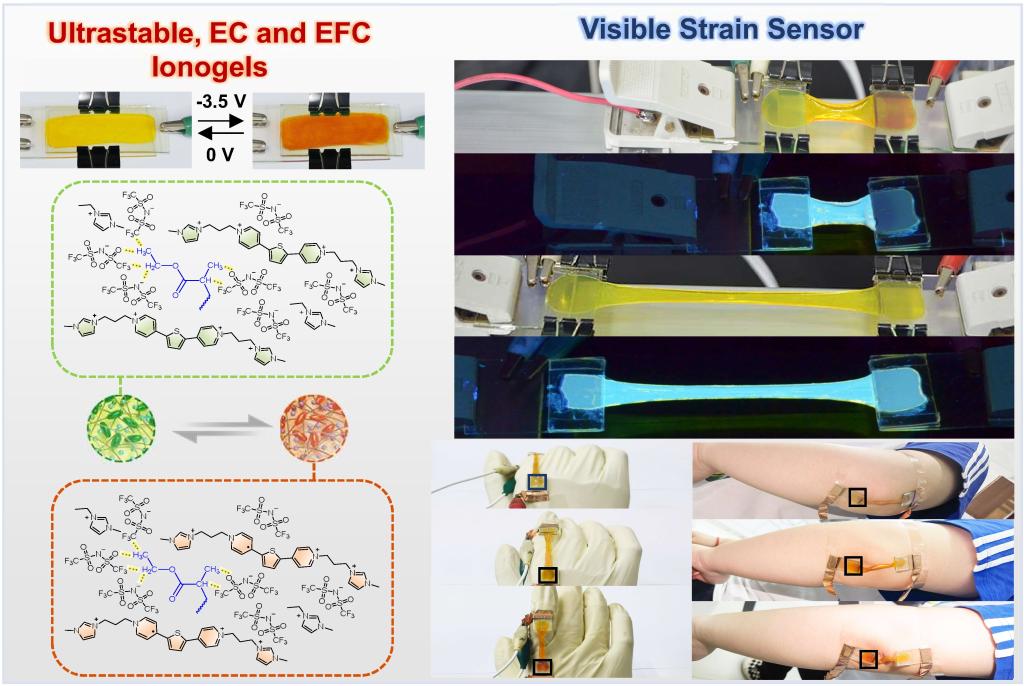 鉴于此,西安交通大学何刚、邵金友、刘子顺联合华中科技大学黄永安组成学科交叉研究团队,在前期含硫族元素紫精的研究基础上,将噻吩紫精电致变色材料与离子凝胶相结合,研制出具有应变感应性能的变色传感材料。含噻吩紫精的离子凝胶兼具电致变色、电致荧光变色的特性,同时聚合物骨架的存在大大提升了电致变色材料的稳定性,使得此类材料露置在空气中数月甚至两年之后仍具有良好的力学性能和电致变色性能(超过500次的拉伸循环和电致变色循环)。更重要的是,该变色凝胶的电导率随凝胶的拉伸程度明显变化,导电率的变化进而影响了材料电致变色的性能,因而该材料可将拉伸信号转化为光学信号,从而实现了对应变的可视化传感。这项工作为研制可穿戴变色传感器件提供了一种简便易行的方法,具有巨大的应用前景和社会经济价值。