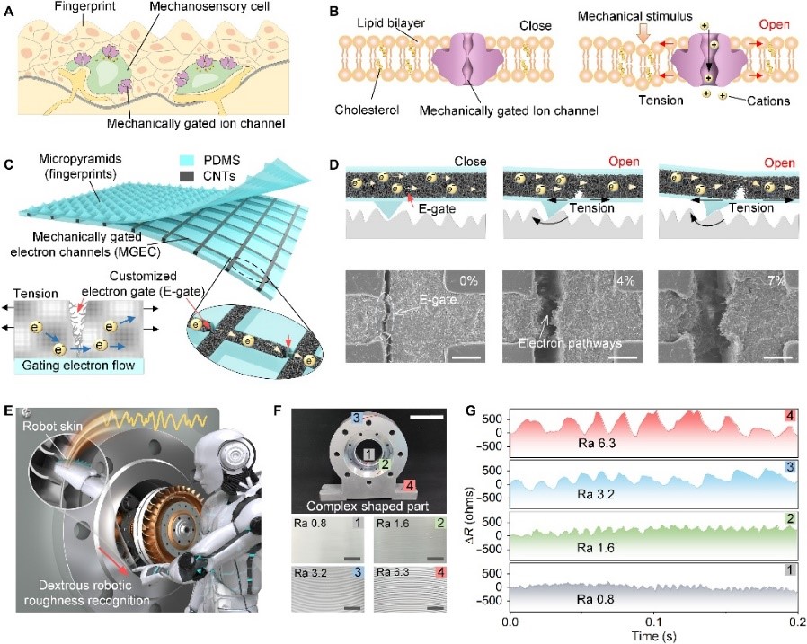 受生物组织细胞膜上的机械门控离子通道启发,西安交通大学邵金友、陈小亮团队提出了仿生“门控传感”新模式。该团队通过应变分布调控策略在镶嵌式导电通路内定域生成电子门控结构,开发了高灵敏度、快响应、高稳定的机器人滑觉皮肤,如图1所示。机器人滑觉皮肤表面的微金字塔阵列可模仿皮肤指纹结构与物体表面进行滑动交互,将动态应变传递至机械门控感知结构实现导电通路的开闭切换,从而将触觉信息编码为电信号。嵌入式网格化的导电通路设计有效增强了电子门的局部应变,提升感知灵敏度;同时削弱传导路径的应变,抑制敏感材料裂纹产生,实现仿生滑觉皮肤灵敏度和稳定性的协同增强。该滑觉皮肤能够灵巧识别复杂结构件表面纹理,例如,对机械加工部件的粗糙度的辨识度优于Ra0.8,能够直接识别5μm线宽的精细表面纹理,响应频率达485Hz,为目前相关领域报道的最优值,在机器人智能识别和交互反馈方面具有广阔的应用前景。