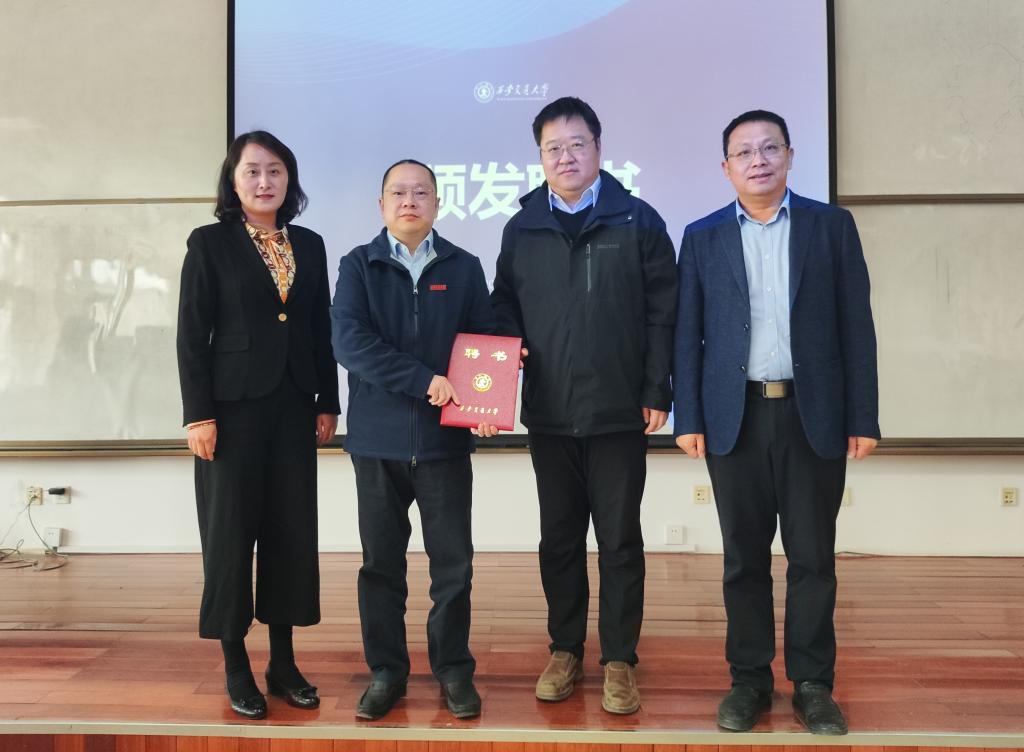在热烈的掌声中,人力资源部焦在滨副部长分别为孙一峰和骆立俊颁发聘书并佩戴西安交通大学校徽。