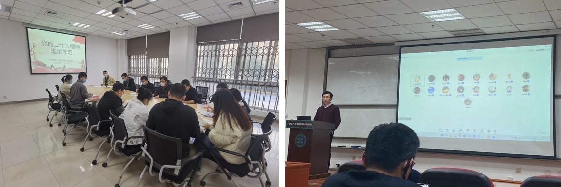 医工交叉师生联合党支部将个人自学与集中讲授有机衔接,利用专题学习会集中组织开展党的二十大报告学习,党支部书记郭保林教授重点对党的二十大报告中的“坚持全面依法治国,推进法治中国建设”和“推进文化自信自强,铸就社会主义文化新辉煌”这两个章节进行学习。前沿能源师生联合党支部书记李国平助理教授进一步梳理了党的二十大报告框架体系、内涵要义和重大创新,他表示,支部党员要进一步提高政治站位、振奋精神干劲,深刻领悟“两个确立”的决定性意义,增强“四个意识”、坚定“四个自信”、做到“两个维护”,始终在思想上、政治上、行动上同以习近平同志为核心的党中央保持高度一致,把党的二十大精神不折不扣贯彻到科研学习的具体实践中。